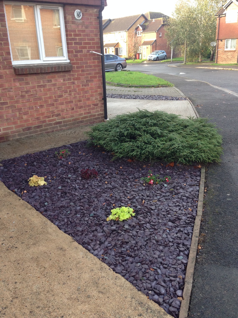 Tasked to re-lay the rear lawn whilst also extending the BBQ patio and creating a new flower border. A new low-maintenace landscape for the front garden and alongside the driveway. All areas were jetwashed. Old & new patio re-pointed. Now with easier access in & out of the car on the driveway.